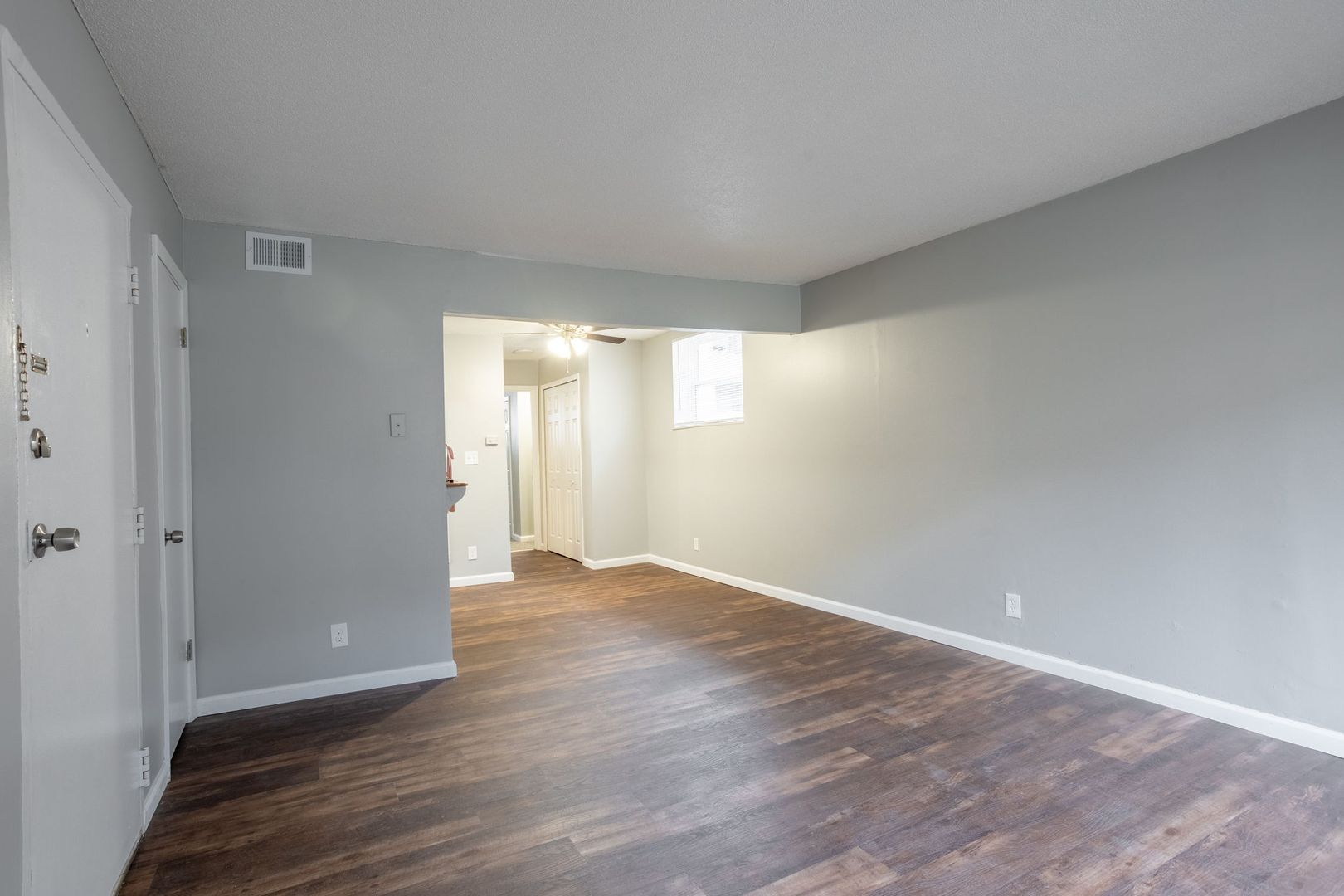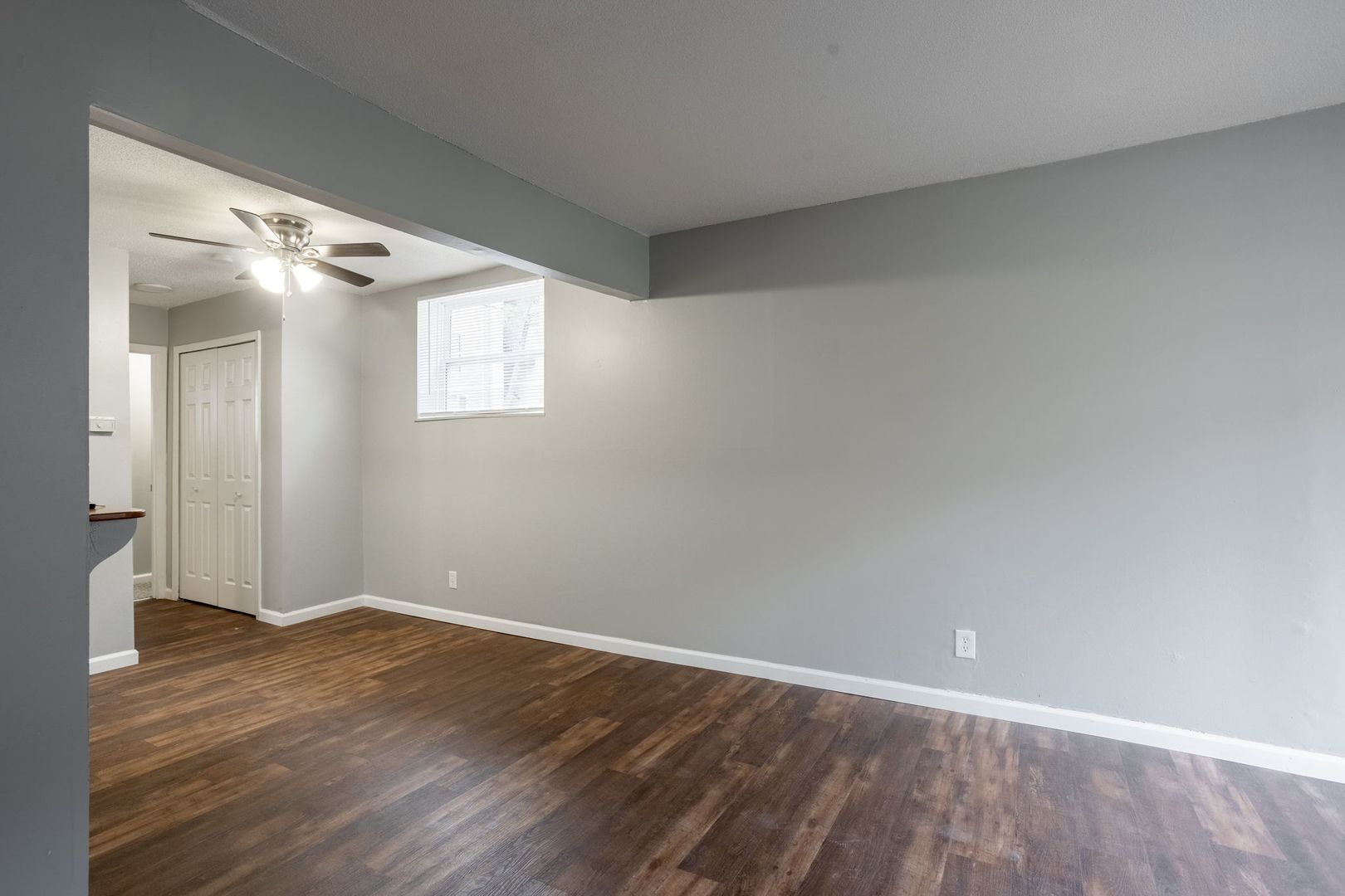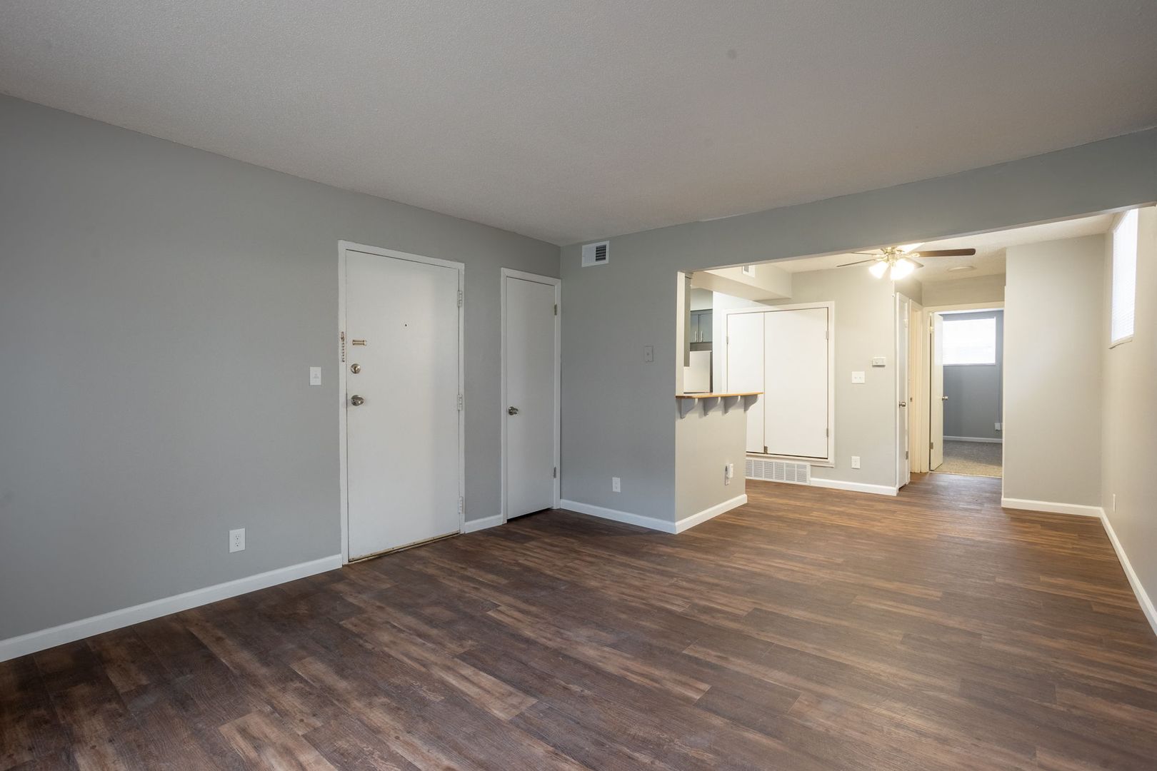 ~Spacious living room with dining area and ceiling fan