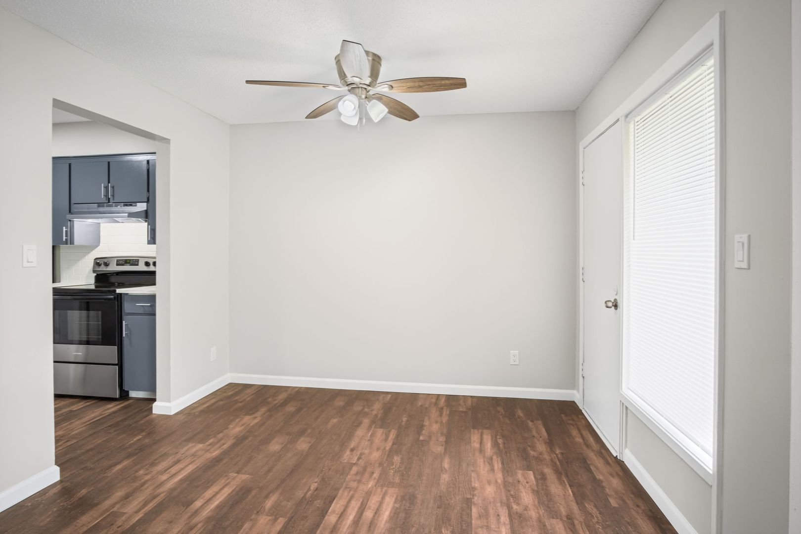 ~Spacious living room with dining area and ceiling fan